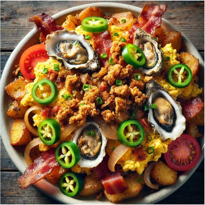 Oyster Scramble | Eggs scrambled with bacon, onions, tomatoes, potatoes, topped with fried oysters and jalapenos | $18.00 |